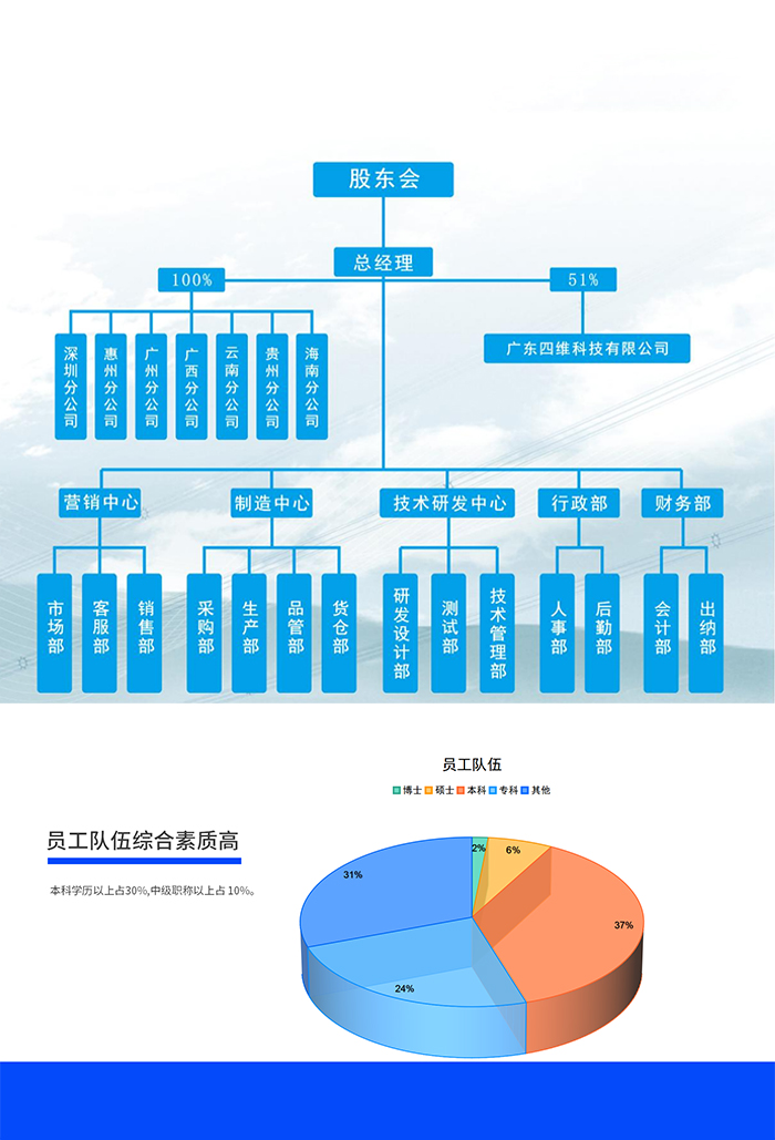 廣東四維科技有限公司員工隊(duì)伍綜合素質(zhì)高,本科以上學(xué)歷占比超30%,中級(jí)職稱以上超10%。